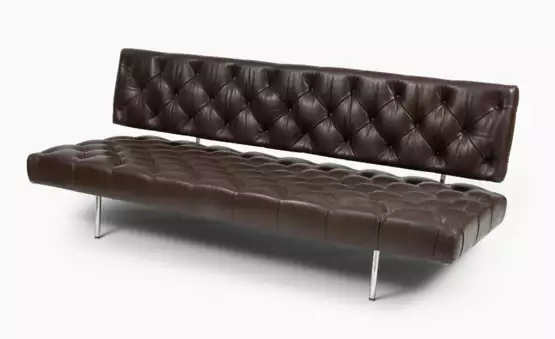 Entwurf 1957 für Teo Jakob, Bern. Stahlrohr, verchromt. Gepolstert, brauner Lederbezug. Rückenlehne abklappbar. Sitzhöhe 43 cm. 193x90x70 cm.