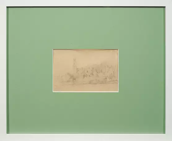 Mit wenigen, wohl gesetzten Strichen erfasste Panoramaansicht mit weithin sichtbarer gotischer Kirche mit hohem, schlankem Glockenturm. Hinter Weiden, die auf einen Flußlauf deuten, nordfranzösische Kleinstadthäuser mit ihren markanten, ungezählten Schornsteinen. Aus einer normannischen Seefahrerfamilie in Honfleur stammend, entwickelte sich Boudin zu einem der wichtigsten impressionistischen Freilichtmaler und Schilderer der Küstenregion an der Mündung der Seine. Bleistift/Papier. L. u. sign.; Rückseitig Angaben des Vorbesitzers zur Provenienz und Darstellung. Ger. stockfleckig, rest.; 13 cm x 20 cm.