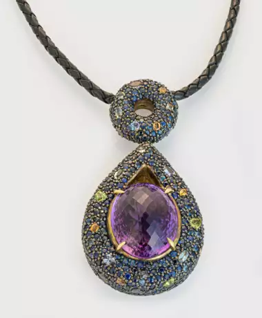 Silber, gest. 925, vergoldet. Zentral besetzt mit einem fliederfarbenen Amethyst von ca. 31 x 25 mm im Briolettschliff, entouriert von blauen, orangenen und grünen Turmalinen, mit Leder-Kette. L. ca. 56 cm. Gew. ca. 91,38 g.