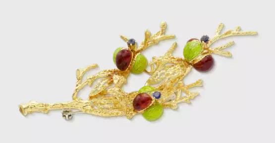 Gelbgold, gest. 750, teilw. polychrom emailliert. Filigran plastisch gestalteter Zweig mit stilisierten Blüten, akzentuiert von drei kleinen Saphiren. Schöne Goldschmiedeausführung. Gew. ca. 14,90 g.