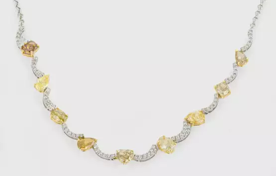 Necklace set with natural fancy yellow/brownish yellow diamonds approx. 5,53 ct. and white diamonds approx. 0,51 ct. (G-H/si), in 18 k white gold. Certificate included.