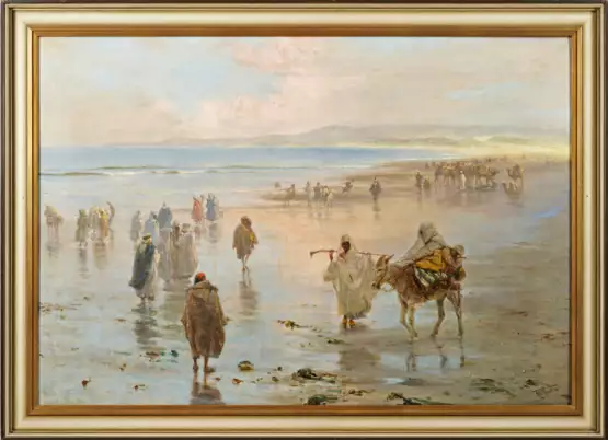 In rötliches Abendlicht getauchte Darstellung eines regen Treibens am Strand, bei dem zahlreiche Beduinen offenbar die Anlandung eines Fischerboots erwarten, das von einer Gruppe von Männern im Mittelgrund an einem Seil aus dem Wasser gezogen wird. Possart studierte an der Berliner Kunstakademie u. a. bei Hans Fredrik Gude und zählt zu den deutschen Orientmalern des späten 19. Jhs.; Bekannt wurde er insbesondere durch seine Ansichten und Szenen aus Südspanien und Marokko. So dürfte auch vorliegendes Werk durch Eindrücke von der Marokko-Reise im Jahr 1891 angeregt sein.