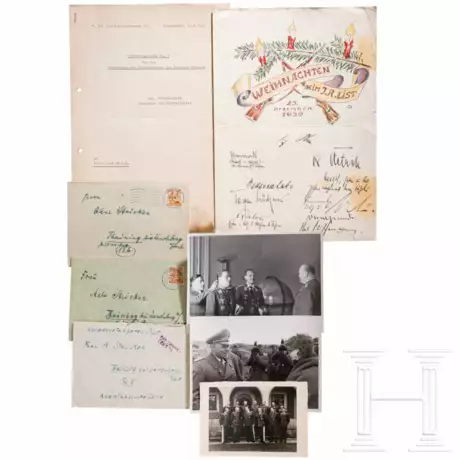 Drei handschriftlich adressierte Briefumschläge mit handschriftlicher Absenderadresse in Nürnberg bzw. Dachau. Dazu drei PK-Fotos, eine unsignierte Vorschlagsliste zum Ritterkreuz der 1. (F) Aufklärergruppe 121 sowie ein Abdruck des Schmuckblattes zur Weihnachtsfeier 1939 des IR "List". Dazu Fotokopein von Briefen und Fotoabzüge.