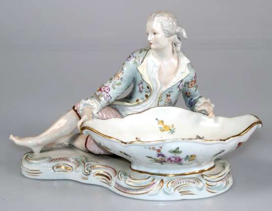 Figur "Kavalier an Schale sitzend", in der Art von Meissen, wohl Gebr. Voigt Porz.-Manufaktur Sitzendorf um 1900, polychrom bemalt mit Goldstaffage (etwas berieben), gekreuzte blaue Linien, Knie min. best., H. …