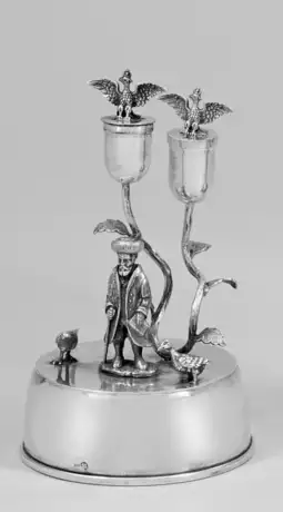 Silber. Auf hohem runden Sockel zwei mit plastisch ausgearbeiteten Eichenblättern besetzte Zweige als Arme für zwei zylindrische Kerzentüllen, bekrönt von zwei Einsätzen mit gekrönten Adlern. Unter den Eichenzweigen die vollplastische Darstellung eines Mannes mit Mantel sowie einer Ente und eines Fasans. Minim rest.; Gest. 800, Herstellerzeichen. Gew. ca. 370 g. H. 20 cm.