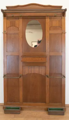 Flurgarderobe, um 1900, Eiche mit Messing-Stangen und 6 -Haken, mit Hutablage und Schirmhalter, 200x112x25 cm