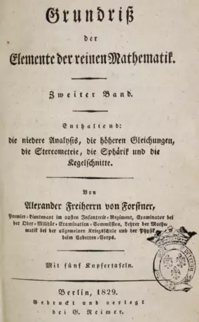 Riccardi I, 190. Erste Ausgabe. - Tls. leicht wurmspurig, St.a.T. - ╔Dabei: Forstner,A.v.╗ Grundriß der Elemente der reinen Mathematik... 2 Bde. Bln., G.Reimer 1826-29. Mit 10 gefalt. Kupfertaf.