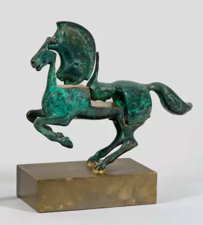 Bronze, teilw. grün patiniert bzw. poliert; montiert auf Messingsockel, der mit einem Bilderfries an der Frontseite punktiert ist. Sign., betitelt u. nummeriert 53/100. Aufspringendes Araber-Pferd mit surrealistisch aufklappbaren Teilen, die unerwartet zwei neue Figuren hervorbringen. H. 19 cm (bzw. 23 cm).