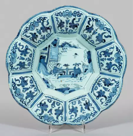 A German blue and white lobed faience chinoiserie dish ("Buckelplatte") in Chinese "Kraak" style. Minor glaze chips to the rim.