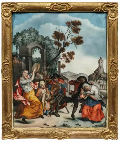 Äußerst detailreiche, heiter gestimmte Genreszene mit musizierenden und tanzenden Bauern vor den Stadttoren. Mit virtuos feinem Pinselstrich und fein nuanciertem bis markant leuchtendem Kolorit gezeichnetes Motiv nach einem Werk von Matheus Berkman(s) (um 1635 - um 1667), das 1754/55 als gestochenes Blatt bei François Basan (1723 - 1797) in Paris erschien und somit einem weiten Publikum zugänglich gemacht wurde. Das vorliegende, in Tempera geschaffene Blatt weist in Stil und Technik deutliche Parallelen zu den Arbeiten des Miniatur- und Kabinettmalers Franz Anton Winter (Winder) auf, der in Immenstadt für Friedrich Reichsgraf v. Königsegg-Aulendorf und den Hof in Sigmaringen tätig war und u. a. eine Serie kongruenter Blätter schuf, welche die vielzitierte Erzählung von „Don Quijote“ verbildlichen. Tempera/Pergament. 45 cm x 36 cm. Rahmen.