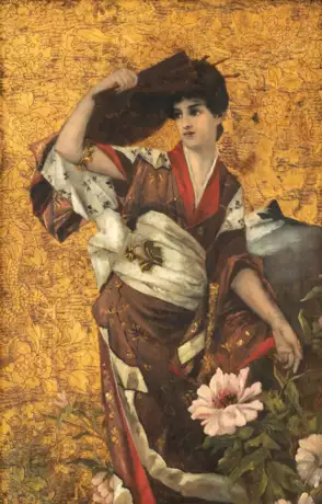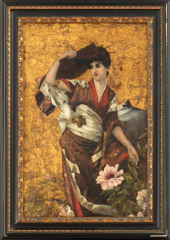 Japanerin im Kimono mit Fächer vor einem Päonienstrauch, 39,5 × 25,5 cm, Öl auf Leder, teilweise craqueliert und leicht gewellt, montiert