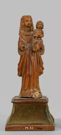 Buchsbaum, vollplastisch geschnitzt. Überaus fein und detailreich ausgeführte, künstlerisch qualitätvolle Statuette im Typus der "Vierge Notre-Dame-de-Bon-Secours". Montiert auf einem Holzsockel, teilw. mit grünem Samt bezogen. Reste einer teilw. Vergoldung. rechte Hand fehlt, teilw. minim. best.; Skulpturen-H. 12,5 cm; Ges.-H. 17,5 cm.