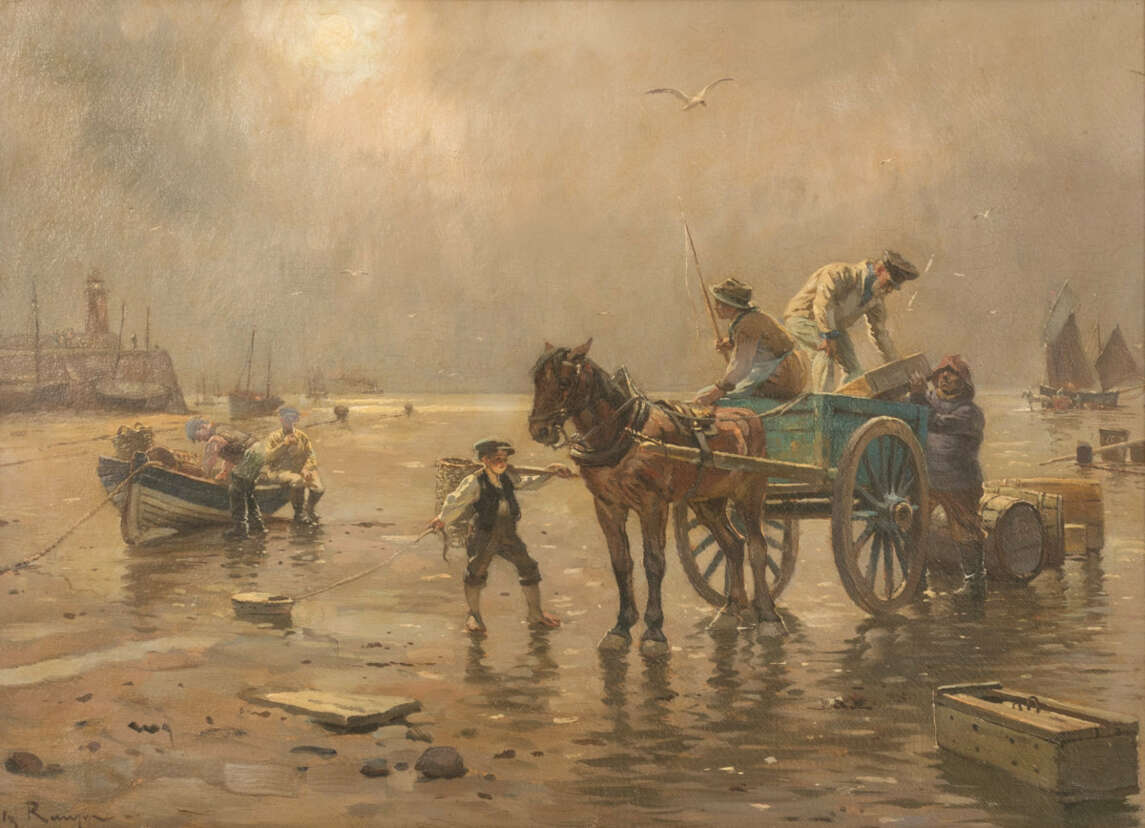 Fischer mit Pferdekutsche am Strand, Öl auf Papier auf Holz, 48 x 68 cm Sichtmaß, signiert, montiert, partiell leicht craqueliert und kleine Farbabplatzer, oben rechts kleiner Riss, reinigungsbedürftig