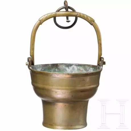 Messingguss. Korpus in breiter Kelchform mit leicht abgesetzter Lippe und Stand. Am Rand zwei kantige Henkelösen. Der Rand seitlich der Ösen leicht eingerissen. Originaler Bügelhenkel mit stilisierten Delfinen und originaler Hängeöse. Höhe ohne Henkel 10,5 cm.