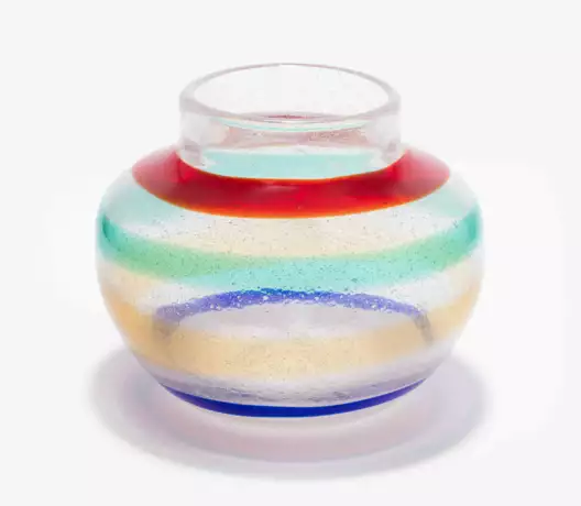 Entwurf um 1960. Farbloses Pulegoso-Glas mit horizontal aufgeschmolzenen Bändern in Rot, Grün, Gelb und Blau. Im Stand signiert "Cenedese" (graviert). H 18 cm.
