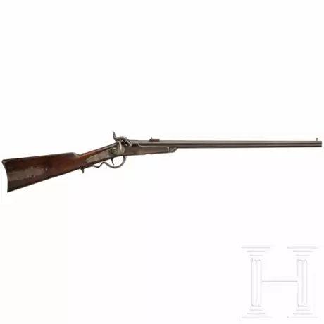 S/N 17208, Kal. .50, gezogener, runder Lauf. Lauflänge 22 1/2". Klappvisier. Schlossplatte gemarkt "Gallager's Patent/July 17,1860" und "Manufactured by Richardson & Overman, Philad". Nussholzschaft mit Kolbenfach. Lauf brüniert, mit geringen Lagerspuren. Verschluss weiß poliert, fleckig. Hahn, Schlossplatte, Reitstange und Abzugsbügel noch schwach buntgehärtet und mit Resten von braunem Lack. Länge 100 cm.