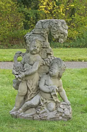 Steinguss. Vor stilisierter Ruienenkulisse mit üppigem Blütendekor zwei vollplastisch gestaltete Puttenkinder mit Blüten bzw. Sichel und Ährenbündel als Personifikationen von Frühling und Sommer. H. 110 cm.