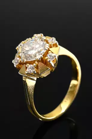 Gelbgold 750 Ring mit Brillant Solitär (ca. 1.53ct/VVSI2/W) und 6 kleinen Brillanten (zus. ca. 0.20ct/VSI/W), 6,8g, Gr. 56