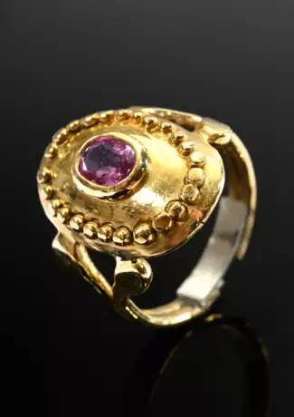 Gelbgold 900 Ring mit rosé Saphir in ovalem Ringkopf mit umlaufender Perllünette, Unikat Wolfgang Kaiser um 2015, 8,1g, Gr. 59, Ringschiene verändert
