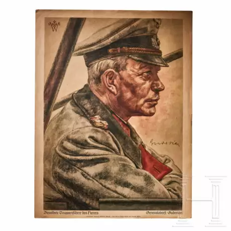 A profile portrait of Guderian with overcoat and visor cap. On the right side his printed signature, the upper left corner monogrammed "W 1941" by the artist. The series "Bewährte Truppenführer des Heeres" (proven troop leaders of the army) had been published by "Verlag Grenze und Ausland" in 1943. Dimensions ca. 45x34cm.
