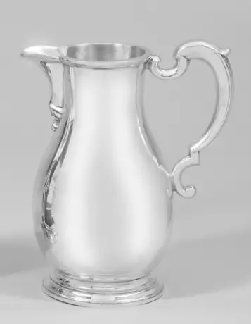Sterlingsilber. Auf rundem, profiliertem Fuß birnförmiger Korpus mit hoch angesetztem Ausguss. Rückseitig Ohrenhenkel aus C-Schwüngen. Gest. Beschaumarken, Herstellerzeichen, Jahresbuchstabe "B". Gew. ca. 1470 g. H. 24 cm.