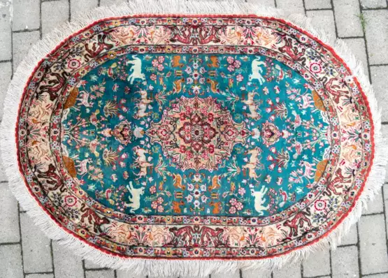 Ghom, Seide, oval, türkisgrundig, mit Floral- und Tierdarstellungen, 118x80 cm