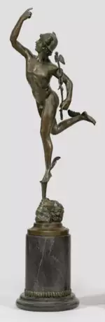 Bronze, dunkelbraun patiniert; Gießereistempel "L'art Bronze / Qualite France". Säulenplinthe aus dunklem Marmor und schmalem Bronzestreifen. Zeitgenössischer, posthumer Guss (Ende 20. Jh.) des Merkur nach dem berühmten Original Giambolognas im Museo Nazionale del Bargello, Florenz. Ges.-H. 70 cm.