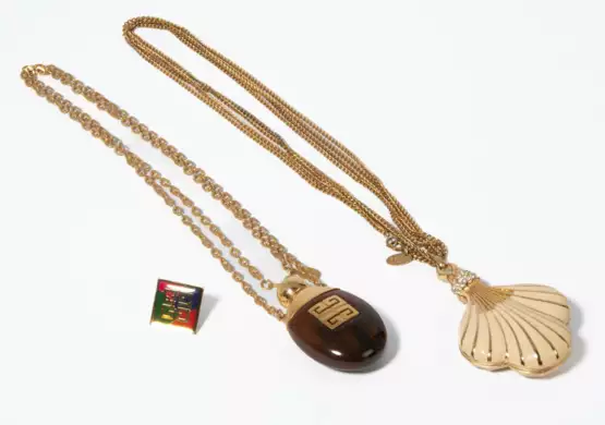 Aus goldfarbenem Metall, braunem marmoriertem Kunststof und elfenbeinfarbenem Emaildekor. Diverse Formen und Ausführungen. Beigegeben: Givenchy Pin. L (Flakon) 5 und 6,5 cm.