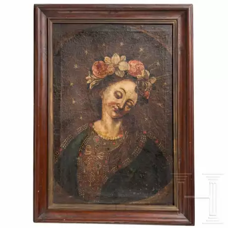 Öl auf Leinwand. Entzückendes Madonnenbild vor dunklem Hintergrund. Mit Blumenkranz aus weißen Lilien und Rosen bekrönt, neigt Maria voller Anmut ihren Kopf zur Seite. Unter blau-grünem Mantel trägt sie reich mit Perlen und Juwelen besetzte Kleider mit einem über die Schulter geworfenen Schleier. Craquelée. Firnis verschmutzt. Stellenweise Abplatzungen, von diesen einige retuschiert (die Fehlstellen etwas gedunkelt). Die Leinwand stellenweise repariert. Im mehrfach profilierten Holzrahmen. Bildmaße 72 x 48, Maße mit Rahmen 86 x 63 cm.