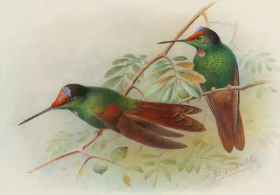 (1858 in Præstö - Bedford 1940). Zwei Kolibris auf Ästen. Aquarell 1911. Ca. 13,5 x 20 cm. Unt. re. sign. u. dat. Unter Passep. u. Glas gerahmt (nicht ausgerahmt).