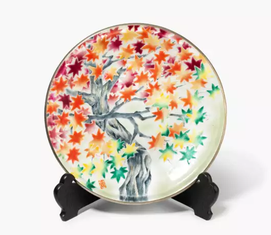Japan, 20.Jh. Osaka, Shôbidô. Email, musen shippô-Technik. Ahornbaumdekor mit Herbstblättern in Rot-, Gelb- und Grüntönen. Mit rotem Siegel. D 44 cm. Mit Holzständer.