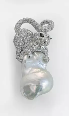 Weißgold, gest. 750. Plastische Darstellung eines Lemurs auf einer schneeweißen Süßwasser-Perle in sehr farbintensivem, rosé-blau changierendem Lüster, besetzt mit weißen und schwarzen Brillanten von zus. ca. 3,80 ct. (G-H/vs1-si). Als Anhänger tragbar. Gew. ca. 20,43 g.