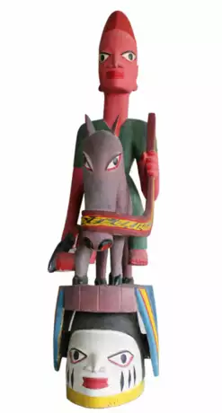Mali 20.Jhdt. Bewaffneter Reiter, Farbige Fassung Holz, farbige Fassung. H: 105 cm. Feine Schnitzarbeit aus einem Stück.