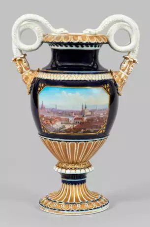 Amphorenförmiger Korpus, umzogen von reliefierten Ornamentbordüren. Seitliche, aus plastischem Akanthusblattansatz aufsteigende Henkel in Gestalt von spiralförmig eingerollten Schlangenpaaren. Schauseitig in kobaltblauem Fond ausgesparte, achtkantige, teilw. goldornamentierte Reserve. Darin die minutiös dargestellte Ansicht von Dresden mit Blick von der heutigen Neustadt mit Häuserzeilen über die Augustusbrücke auf die Altstadt, darunter die Frauenkirche, die Hofkirche und der Hausmannsturm mit Residenzschloss. Die rückseitige Reserve mit Blumenbukett. Äußerst feine polychrome Malerei mit Goldstaffage. Form-Entw. Ernst August Leuteritz. Modell-Nr. A 148. Unw. rest.; Minim. ber.; Schwertermarke. H. 48 cm.