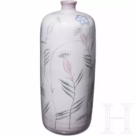 Steingut, weiß glasiert. Rundum Blütendekor in Blau, Rosa und Braun. Unterseite mit Werkstattmarke "HB" und Nr. "1134". Mündung mit kleinen Glasurabplatzern. Höhe 42 cm.