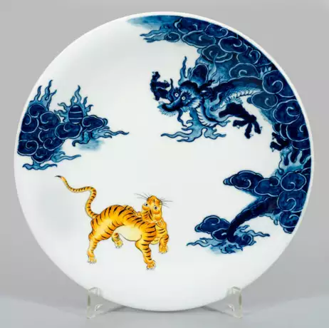 Runde, leicht vertiefte Form mit weit ausschwingendem Rand. Aus dem Wolkenmeer heraustretender Drache. Diesen beobachtender, nach oben blickender Tiger. Unterglasurblaue und polychrome Malerei. Modell-Nr. 54602. Jahreszeichen. Schwertermarke. D. 31 cm.