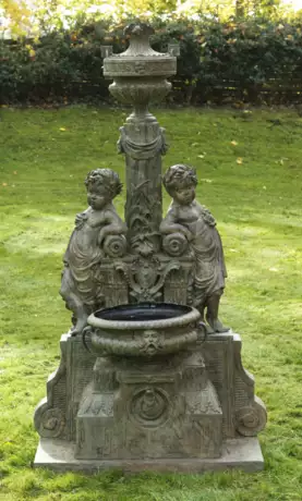Bronze, grün-braun kalt patiniert. Auf flacher Plinthe gestuft ansteigender Sockel mit Lorbeerfries, flankiert von Volutenmotiven. Oberhalb davon ausgehend kannelierter Schaft mit Vasenbekrönung, flankiert von plastisch gestalteten Puttenkindern als Brunnenfiguren. Flache, umlaufend godronierte Brunnenschale. H. 181 cm.