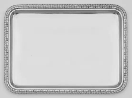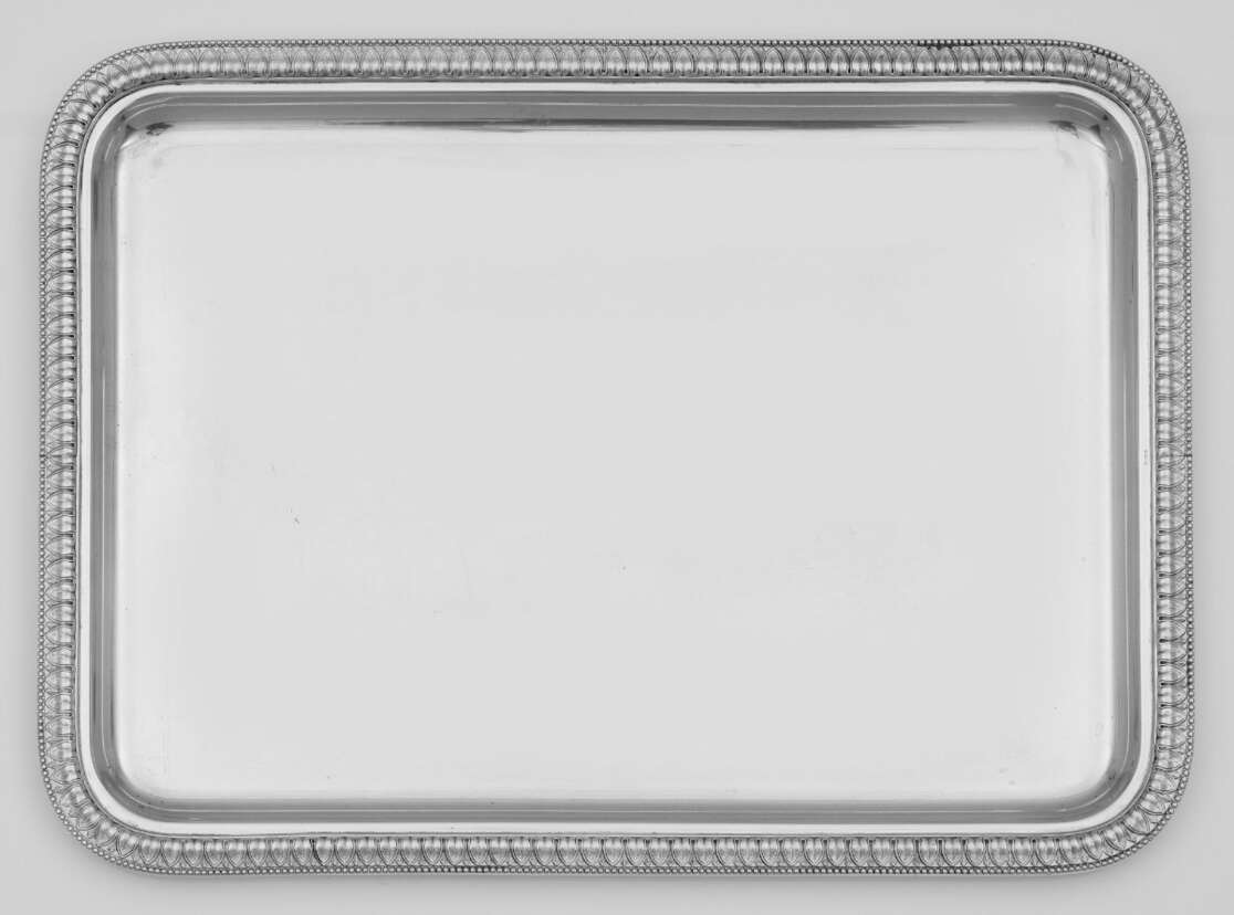 Silber. Rechteckige Form mit gerundeten Ecken. Flacher Spiegel und ausgestellte Fahne mit umlaufendem Palmettenfries und Perlstabdekor. Gebrauchsspuren. Gest. 800, Beschau- und Herstellerzeichen. Gew. ca. 1500 g. 47,5 cm x 34,5 cm.