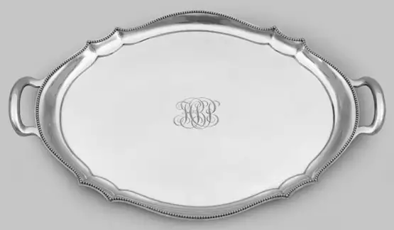 Sterlingsilber. Ovale Grundform mit mittig ligiert monogrammiertem Spiegel, geschweifter Fahne und perlstabgesäumten Rand. Gegenständige, breite Handhaben. Gebrauchsspuren. Gest. 925, Herstellerzeichen, Modell-Nr. 12567 (1895). Gew. ca. 4030 g. 71 cm x 46 cm.