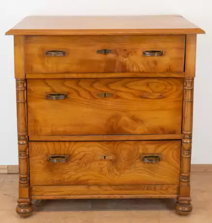 Los 976 | Gründerzeit-Kommode, Esche, 3 Schubkästen, vorn 2 Kugelfüße, 1 Beschlag fehlt, Seiten gerissen, Gebrauchspuren, 89x85x51 cm