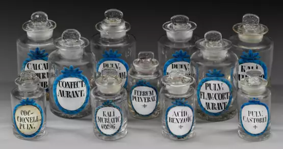 Farbloses, teils graustichiges Glas mit Emailmalerei. Zylinderförmige Gefäßkörper mit waagerechter Schulter. Im kurzen Hals eingeschliffener Stopfen mit gekniffenem Knauf. Auf der Wandung ovale, von blauem Kranz eingefaßte Beschriftungskartusche mit schwarzer Aufschrift auf weißem Grund. Lateinische Inhaltsangaben. Stopfen teilweise mit arabischen und römischen Ziffern graviert. Ein Stopfen unpassend, eine Kartusche berieben, zweimal Lippenrand minim. bestoßen. H. ca. 11,5 cm - 16 cm.