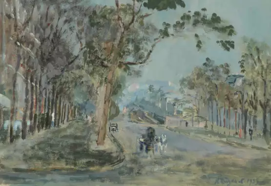 Strassenszene. 1933. Gouache auf Papier. Unten rechts signiet und datiert. Blattgrösse 31x44,2 cm. Gerahmt.