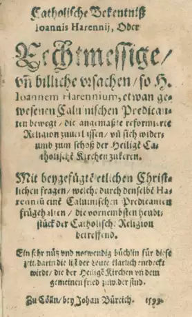 Vgl. VD16 H 578 (Ausg. 1586). Sehr seltene Ausgabe. - Jan Haren, Sohn eines Pastors, der zum Tode verurteilt wurde, floh nach Genf wo er mit Jean Calvin befreundet war, den er im Jahr 1564 sterben sah. Zurückgekehr nach Holland wirkte er mit großem Ansehen und Einfluß als Pfarrer in Brügge. Am 3. März 1586 trat er öffentlich zum Katholischen Glauben über. - Gebräunt u. durchgehend stärker wasserrandig, Ebd. etw. fleckig.