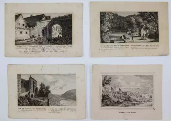 ╔Enthält u.a.:╗ Das Schloss von der Molkenkur. Kolor. Stahlst. v. Oeder nach Verhas bei Meder, Hdbg. (Mitte 19. Jh.), 8 x 10 cm. - Der dicke Thurm auf dem Heidelberger Schlosse. Kupferst. v. Grape nach Meyer bei Hildebrand, Ffm. (um 1830). Qu.8°. - Weitere. Versch. starke Gebrauchsspuren, tls. unter Passep. mont.