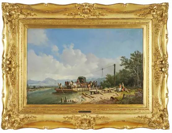 Bürkel zählt zu den großen Beobachtern und Schilderern des Volkslebens zur Zeit des Biedermeier. Sein Thema ist das Wirken und Wandeln des einfachen Menschen in und mit der Natur. Milieuschilderung und Landschaftsmalerei bilden dabei eine selten erreichte Synthese. So zeigt vorliegendes Bild im Rahmen einer Fährüberfahrt verschiedene Typen von Bauern und Jägern, den stakenden Fährmann und einen Pfarrer in seiner Kutsche charaktervoll und lebendig geschildert in sommerlicher Voralpenlandschaft am Ufer von Isar oder Inn. Öl/Lwd.; R. u. sign.; 37 cm x 54 cm. Rahmen.