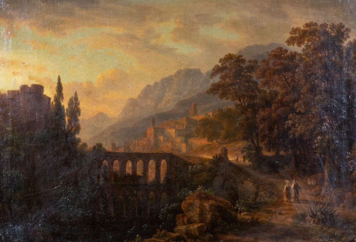 Mediterrane Landschaft, Öl auf Leinwand, 34 × 49 cm Leinwandmaß, rückseitig Reste eines alten Aufklebers, handschriftlich bezeichnet, partiell restauriert am linken Rand, Oberfläche craquelliert, reinigungsbedürftig