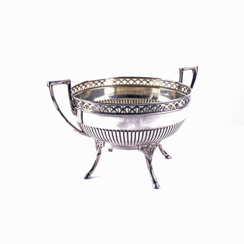 Deutschland, Schwäbisch Gmünd, Gebrüder Kühn, um 1900, Feingehalt 800, punziert Halbmond Krone, über drei Rehbeinen Standring mit Zahnstabfries, balusterartiger Schaft mit Perlfriesen, runde gerippte Schale innen vergoldet mit außen umlaufendem, reliefiertem Blattfries, Höhe 18 cm, hohl, Gesamtgewicht ca. 539 g, Polier- und Gebrauchsspuren