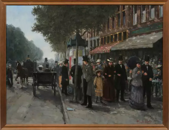 Reizvolle, impressionistisch angelegte Ansicht eines durch flanierende Personen und Pferdekutschen belebten Großstadtboulevards in der Zeit der Jahrhundertwende. Charakteristisches, in warmen Erdtönen angelegtes Werk de Kortes, der als Kind nach Australien zog, wo er 1957 sein Kunststudium an der East Sydney Art School begann und später an der Akademie in Rotterdam vollendete. Öl/Lwd.; R. u. sign.; 70 cm x 90 cm. Rahmen.