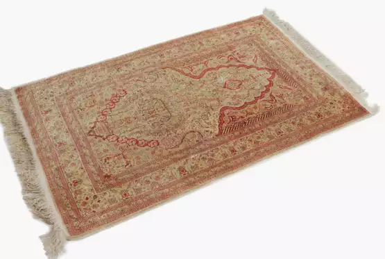 NW-Türkei, um 1970. Flormaterial und Kette reine Seide. Dichtes florales Werk. Unter einem, mit Gabelranken und Arabesken verzierten goldgelben Giebel figuriert auf hellem Grund eine prachtvolle, blumengefüllte Vase, begleitet von Blütenketten und einer dekorativen Blattranken-Musterung. 2 dekorative Nebenbordüren säumen die filigrane goldgelbe Hauptbordüre, die mit stilvollen Blütenpalmetten geschmückt ist. Kleines fehlendes Stück in der Aussenborte, ansonsten gute Erhaltung. 114x133 cm (ft. 3.8x4.4).