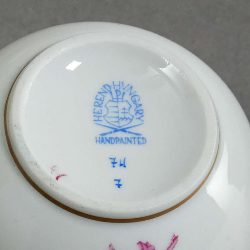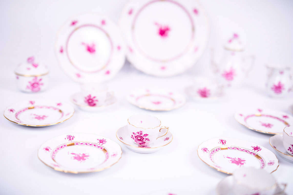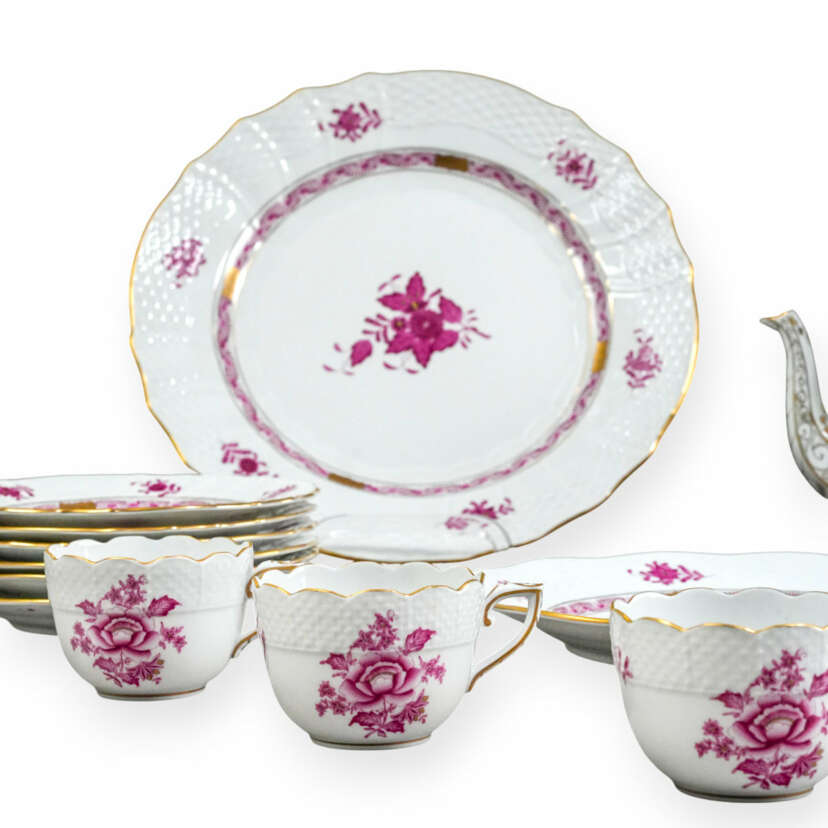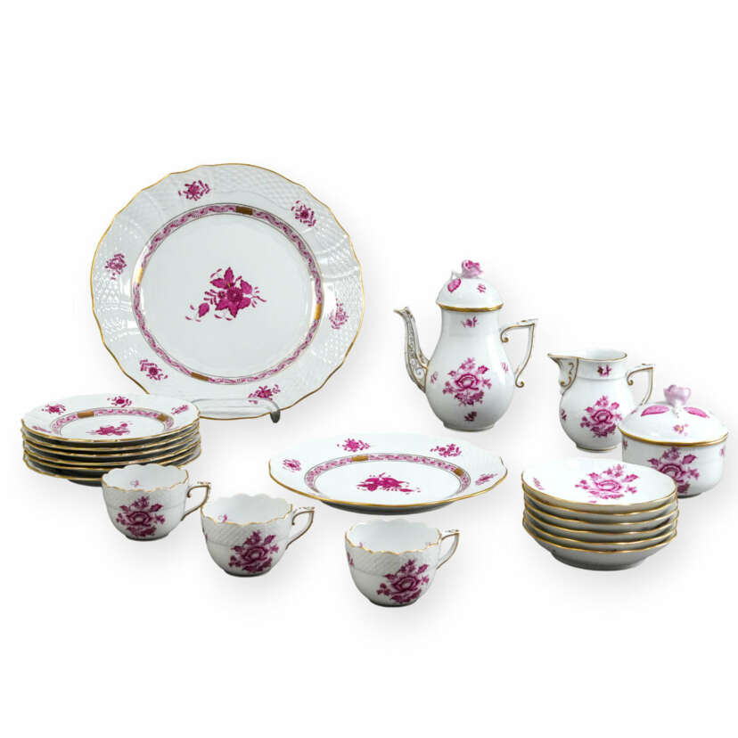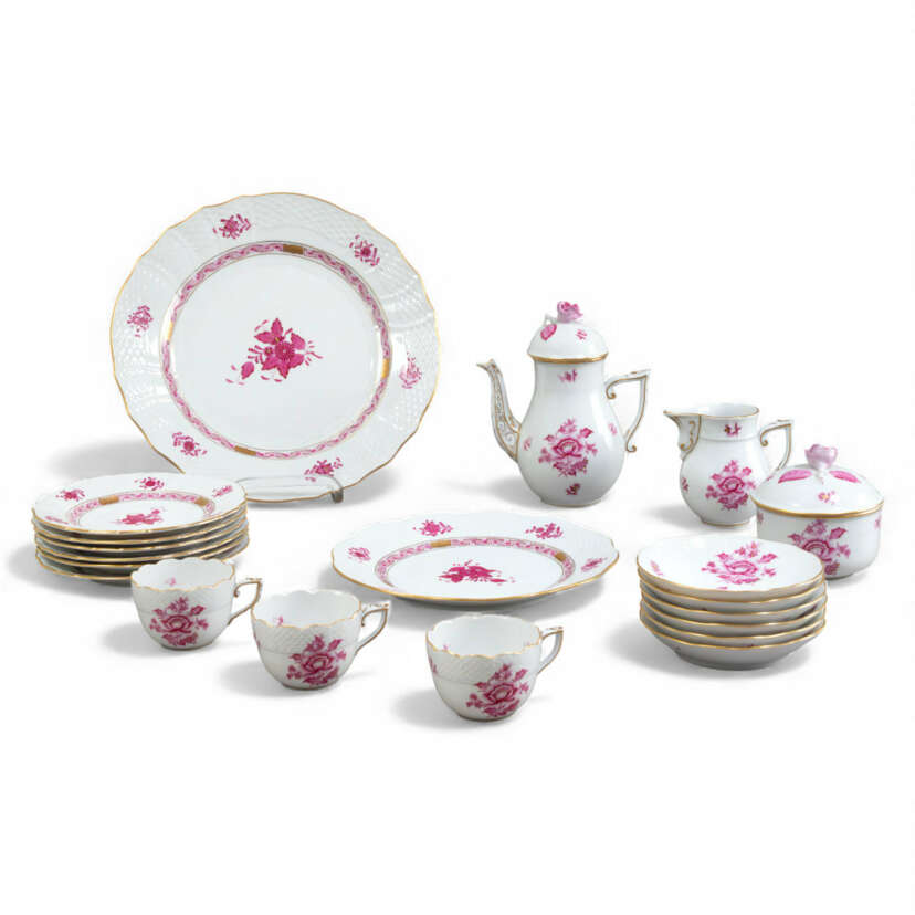 23-tlg., Ungarn, 2. Hälfte 20. Jh., Porzellan, monochrom purpur bemalt, goldstaffiert, bestehend aus sechs Mokkatassen mit Untertassen, sechs Frühstückstellern, Beilagenteller, Servierteller, Kaffeekanne mit Deckel, Milchkännchen, Zuckerdose mit Deckel, alle Teile mit Manufakturmarke, Malermarke, Modellnummer